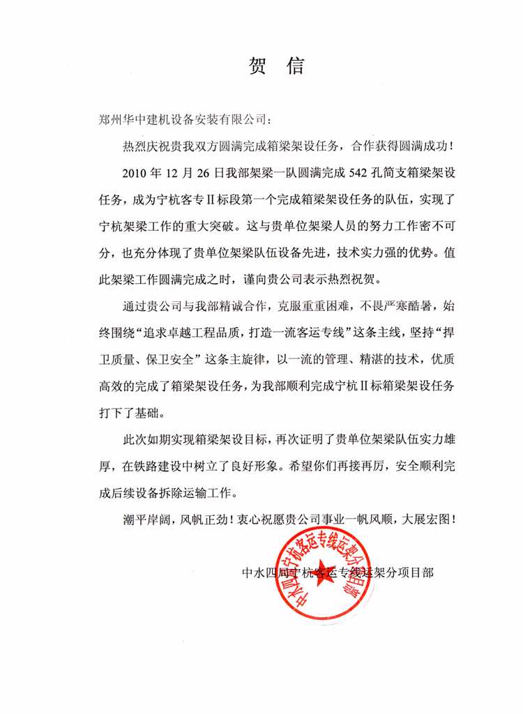 我公司与中水四局宁杭客运专线运架分项目部合作,于2010年12月26日圆满完成542孔简支箱梁架设任务,成为宁杭客运专Ⅱ标段第一个完成架设任务的队伍。