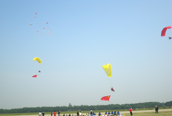 当天早上九点钟伴随着音乐的响起开幕仪式正式开始。随着主持人的指示我们看到六名跳伞队员对从高空降落,随后又有五名女跳伞队员从1000米高空降落,她们是多次获得世界、全国冠军的河南省跳伞队空中芭蕾的队员,当真印证了“巾帼不让须眉”。随后还有飞行编队超低空飞行表演;飞行编队拉烟通场飞行表演;直升机特技表演;多次获得世界、全国冠军的的河南省航模队多种特技表演等,获得了观众热烈的的掌声。
