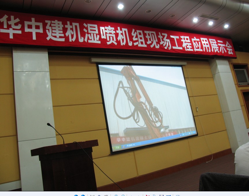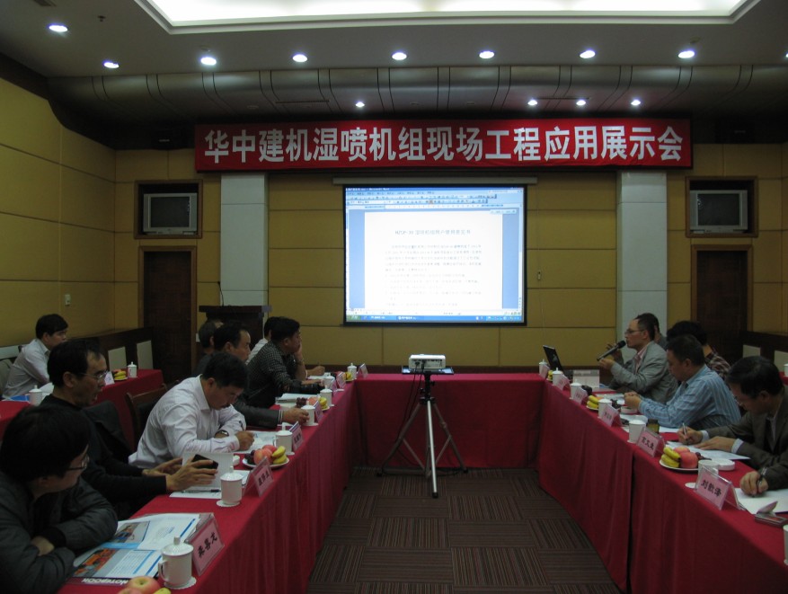 在2010年7月在郑州华中建机公司的新厂区召开了“混泥土湿喷机组”样机的出厂评审会。根据出席会议的各位专家、领导的建议。华中建机公司研发团队对样机进行了系统的完善和整理。在中铁隧道局领导的支持下,该湿喷机组运抵烟台隧道工地并很快投入工程施工应用,历经近一年的工程施工考核,在2012年10月27日,华中建机湿喷机组现场工程应用会在烟台隆重召开。