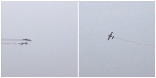 看,会场上迎来了英国飞行员的编队特色战机,随着一道道彩虹划破天空,飞机时而像大雁排队翱翔,时而瞬间分离,随着机翼的高高低低,飞机的轰轰声响彻天空。
