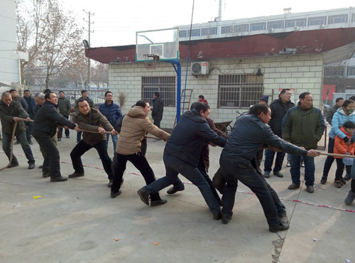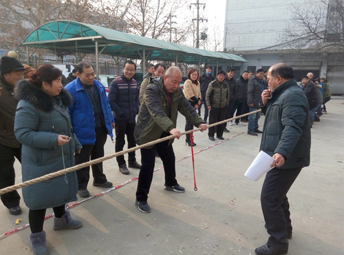 2016年12月30日下午2点半,我公司组织员工文化娱乐活动,告别辛苦工作的一年,迎接全新的2017新年,活动由工会主席王根成主持,总经理宋鹏伟进行致词,回顾2016年工作内容与成果,展望新年美好未来,并对辛苦工作的员工表示感谢。随后工会主席对活动内容进行介绍,并讲述了相关活动规则,仪式完成后活动正式开始进行。最具吸引力的是拔河比赛,经过抓阄,班组之间进行对决,拉拉队加油口号震天响,参赛人员鼓足力气用力拼搏,经过多轮竞选,李遂森班组获得一等奖,成为拔河冠军。