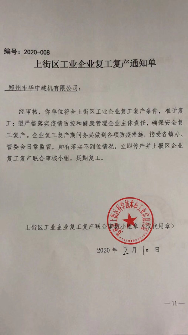 我公司在疫情到来之后积极应对,对员工进行排查,购买防护物资,制定疫情防控方案,通过各种形式宣传新冠肺炎,经过多次申请审核,在2020年2月10日获得区科工局的复工批准,批准编号为2008---008号。获批之后我公司挑选居住在上街厂区附近人员,进行复工生产,给每人配发一个水印温度计,上班领取口罩,加强消杀工作,确保不让疫情传播。