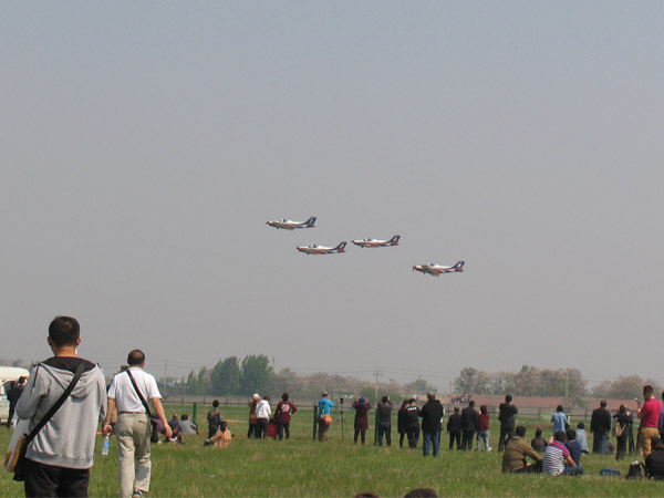 伴随着西班牙斗牛曲,各个飞行队在空中冲天、翻转、俯冲、追击,一缕缕白烟不时在空中划出优美的弧线,不时上演各种高难度表演。只见飞机高空爬行中忽然自由坠落,然后又连续翻滚,时而相对交汇,时而追逐盘旋,时而一起集中时而四向分别。英国百灵空中漫步飞行队的战机最引人注目,飞机上面站立的两个女表演员,在飞机的快速行驶中不时向观众挥手致意,并做出各种惊险动作,引得观众阵阵尖叫。来自上街的三合通用航空三架直升机也参加了表演,优美的外观造型和飞行技巧,让观众过足眼瘾。