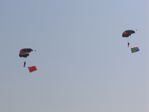 来自国内各地领导和嘉宾出席了此次会议。10点30分,特技表演正式开始,参加表演的有英国百年百灵空中漫步飞行队、罗马尼亚雄鹰特技飞行队、南非无限特技飞行队、战斗民族俄罗斯首航特技飞行队、美国空中海报AVIAD特技飞行队、英国环球之星特技飞行队、意大利开拓者特技飞行队、澳大利亚红男爵特技飞行队、英国刀锋飞行队、英国雅皮士特技飞行队、西班牙双箭特技飞行队、立陶宛总统特技飞行队等。开幕式结束后,多架飞机凌空而过,随后许多降落伞携带彩色烟火缓缓飘落,身背各国国旗的表演人员从天而降,之后又有七名仙女下凡,引来观众的阵阵喝彩。