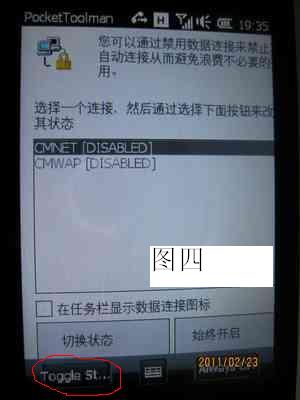 四:点击左下角的Toggle st..切换CMNET CMWAP 使其显示为DISABLED(不使用),这样就可以关闭上网了,需要时再打开。见图四。