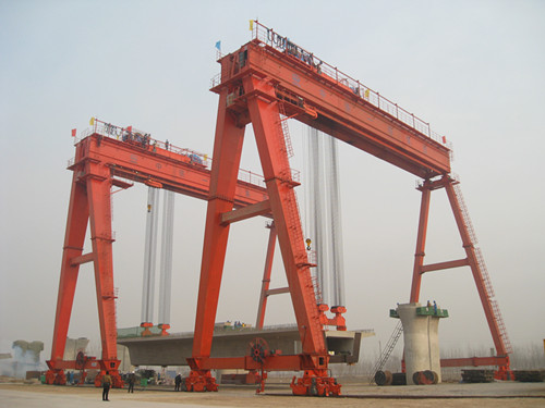 华中建机生产的大型起重设备-提梁机,主要用于高速公路、高速铁路的桥梁建设中混凝土梁的吊装,可2台配套使用在预制梁场或跨越船坞栈桥设备,在固定轨道上运行共同抬吊一片箱梁,完成箱梁在梁场位置的起吊、转移以及为运梁船(车)起吊梁等工作;也可单台使用于起吊、转移以及为运梁船(车)装梁等工作。