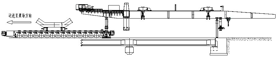 末跨架设完毕,先借助辅助支腿下走形、起吊小车等机构将下导梁从前方退出到后支腿位置;然后用后起重天车、运梁车上的驮梁小车将下导梁放置在运梁车上,再将其运至梁场(图2)。