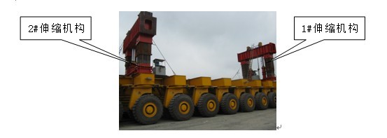 在架桥机起重天车的车架上安装一临时支顶油缸,然后分别将后支腿第四段,中横梁门子架顶起并搬移放置在主梁上;运梁车返回梁场将安装好的伸缩机构运载着(纵向)开入架桥机内部,并将1#、2#伸缩机构伸出并与运梁车用高强螺栓连接(图4)。