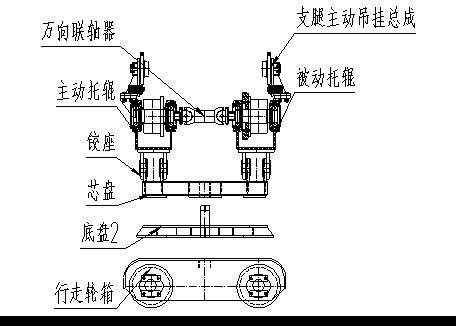 架桥机架设末跨桥时,对面是桥台,架桥机前支腿必须在桥台上运行,所以高度必须降低,本架桥机配备前支腿专门在桥台是使用的底盘2,架设最后末跨时,可把前支腿中间部分整个拆下,把底盘2和芯盘联结,再把底盘2和行走轮箱联结起来,如下图所示。
