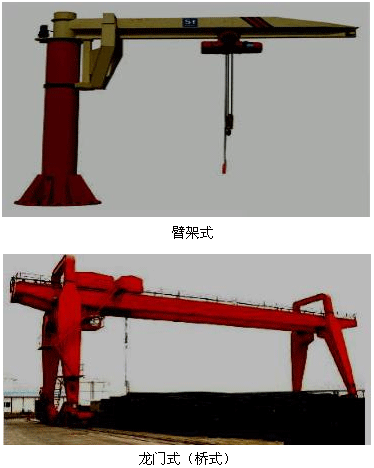 2.起重机。按照构造特征可分为桥式和臂架式、旋转式和非旋转式、固定式和运行式等。