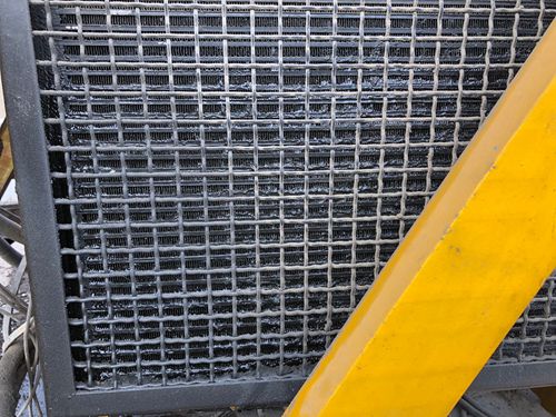 运梁车身负上百吨重物,长时间工作发动机容易出现温度升高,效率下将,发动机相连的散热器承担了快速释放热量的作用,架桥机的运输通道和梁场往往工作体条件差,粉尘严重,车辆所过之处吹起来的灰尘会粘附在发动机各个部件之上,定期一定要进行清理除尘,下图中散热器的缝隙已经被灰尘堵满了,遇到这种情况可以用水管冲洗。另一幅图片是运梁车的液压油散热器油污较多,经认真检查是里面的油管存在轻微渗漏的情况,出现渗漏应当及时更换或者维修油管,不然的的话轻则影响散热,还会让灰尘从渗漏处进入液压油中,造成设备出现故障。